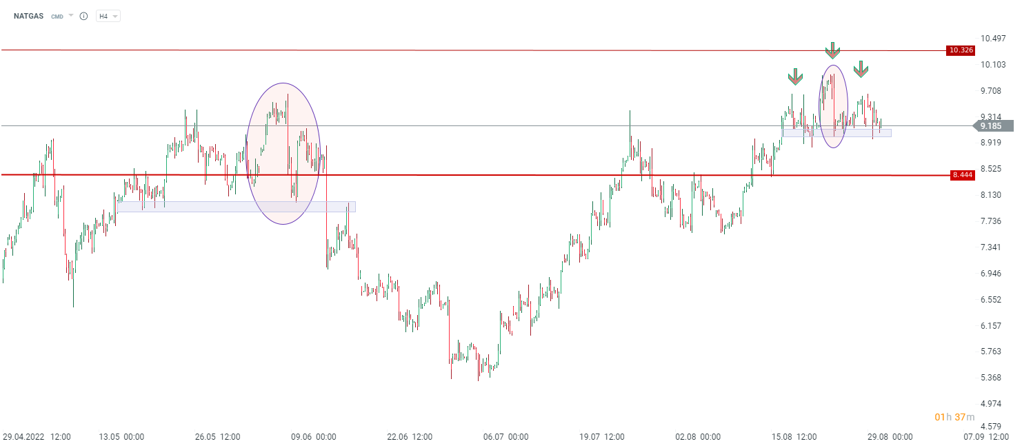 Os preços do gás natural dos EUA (NATGAS) parecem estar a formar um head and shoulders perto da zona dos 9 dólares por MMBtu. A situação actual é semelhante com o que aconteceu no período de Maio e Junho, quando os preços caíram mais de 33%. Fonte: xStation5