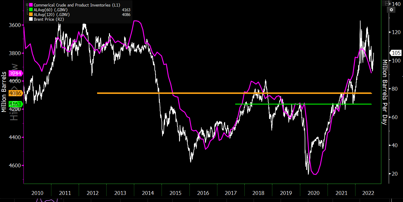 As reservas estratégicas continuam a cair rapidamente enquanto as reservas comerciais se mantêm estáveis. Sem a continuação da libertação de reservas estratégicas de petróleo, as reservas comerciais caíram para níveis mínimos de vários anos.