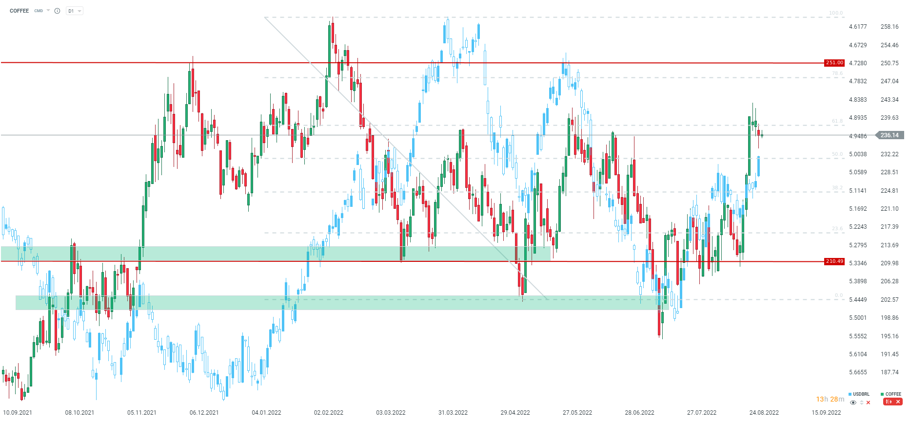 O café tem beneficiado da recuperação do BRL. Além disso, em termos fundamentais, o cenário de alta também parece provável de acontecer. Fonte: xStation5