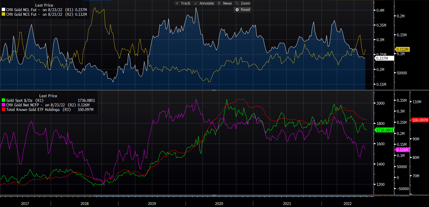 Número de recuperação de posições curtas. Os ETFs continuam a ser vendedoras líquidas de ouro, mas as posições permanecem acima dos níveis mais baixos desde o início do ano.