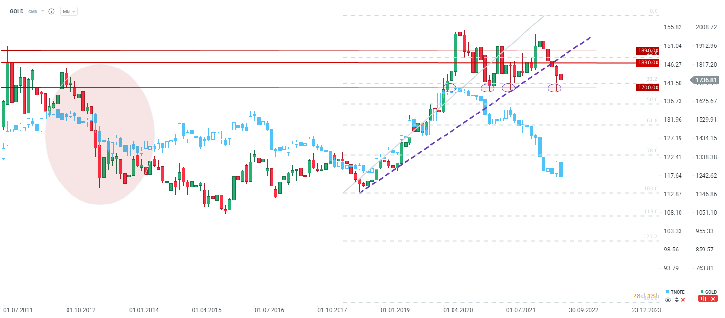 O ouro também tem estado pressionado com o recuo do preço das obrigações nos EUA. Fonte: xStation5