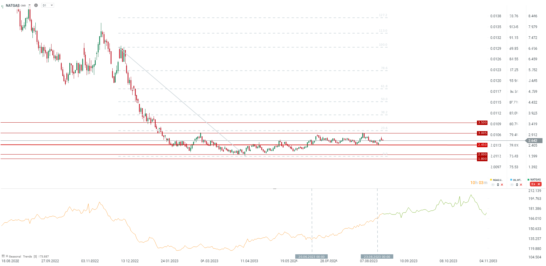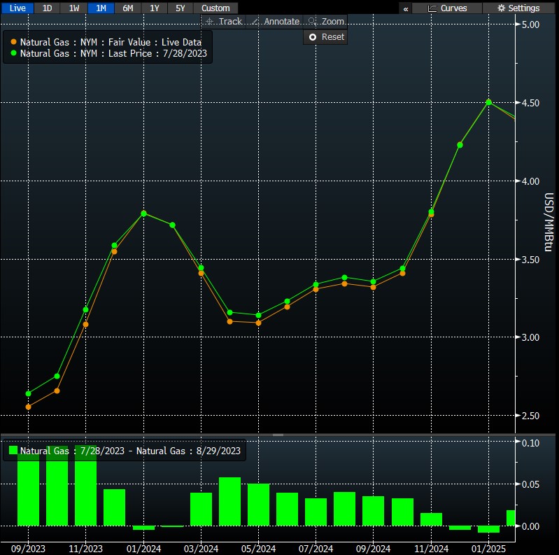 - A curva de futuros indica que a próxima rolagem trará um aumento significativo de preços, implicando um aumento da procura a curto prazo. Se isto se alinhar com um aumento menor das reservas, não se pode excluir uma tentativa de atingir o intervalo de 3,5-4,0$ durante o início do outono