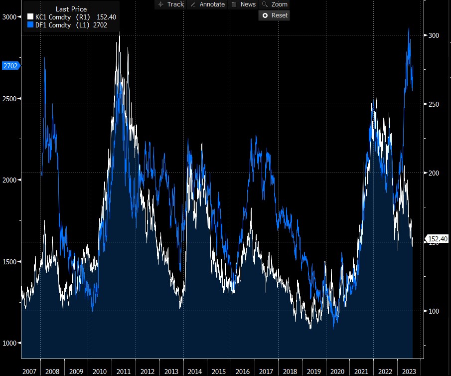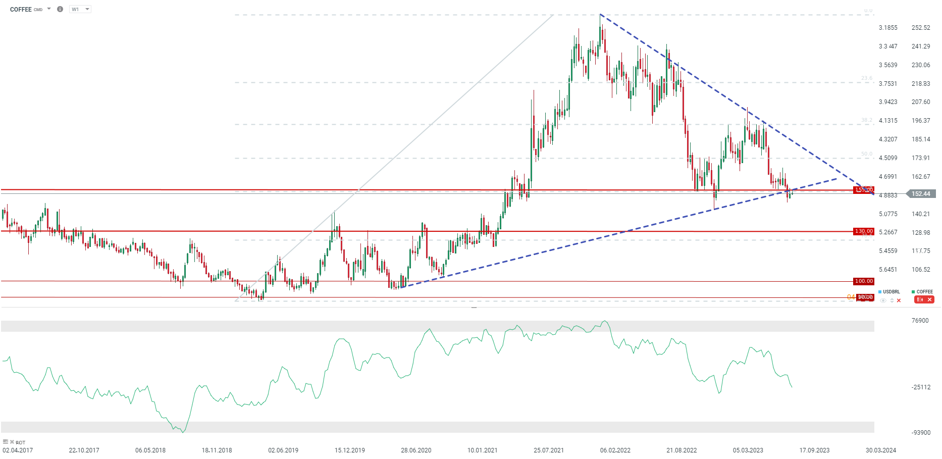 - O café continua sob pressão, caindo abaixo do nível crucial de apoio de 155 cêntimos de dólar por libra-peso