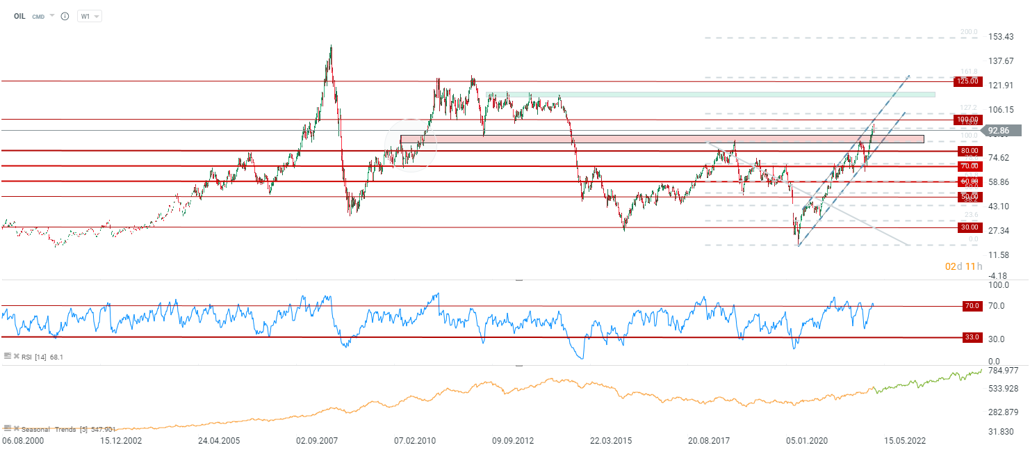 O Brent (OIL) abrandou o movimento de alta perto da zona de resistência marcada com a retração de Fibonacci nos 113%. A próxima zona de suporte a acompanhar deverá estar perto dos 85-87 dólares. Fonte: xStation5