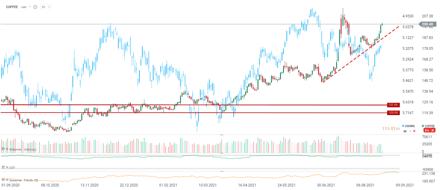 O último aumento dos preçosdo Café (COFFEE) pode ser, até certo ponto, fundamentado pela recuperação do real brasileiro. Potenciais problemas de distribuição no Vietname, bem como as continuas incertezas sobre a produção brasileira, podem apoiar as valorizações nos preços do café. Fonte: xStation5