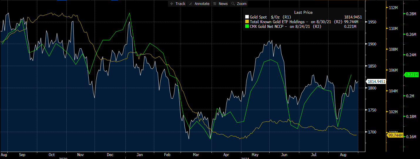 O posicionamento especulativo líquido sobre o ouro situa-se nos níveis mais elevados desde Maio. O ritmo das vendas de ouro por parte dos ETFs abrandou recentemente. Fonte: ETF: Bloomberg