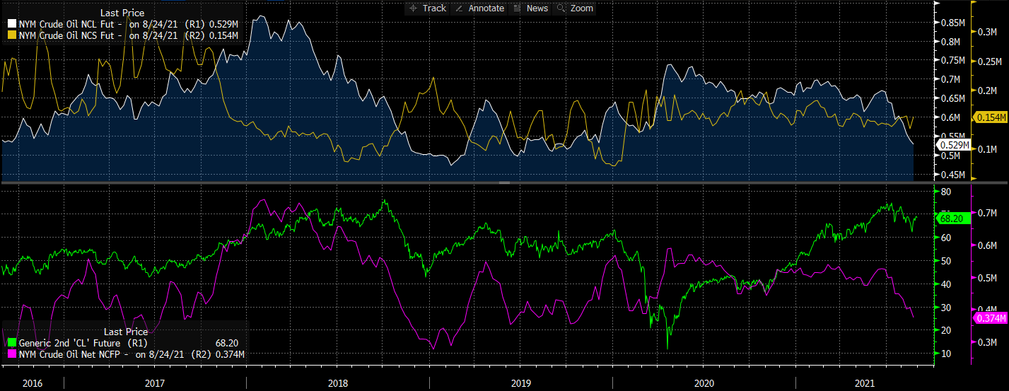 Curiosamente, os especuladores começaram a reduzir as suas posições no petróleo. O número de posições longas abertas caiu drasticamente, enquanto o número de posições curtas abertas aumentou ligeiramente. Como resultado, o posicionamento especulativo líquido caiu . Fonte: Bloomberg