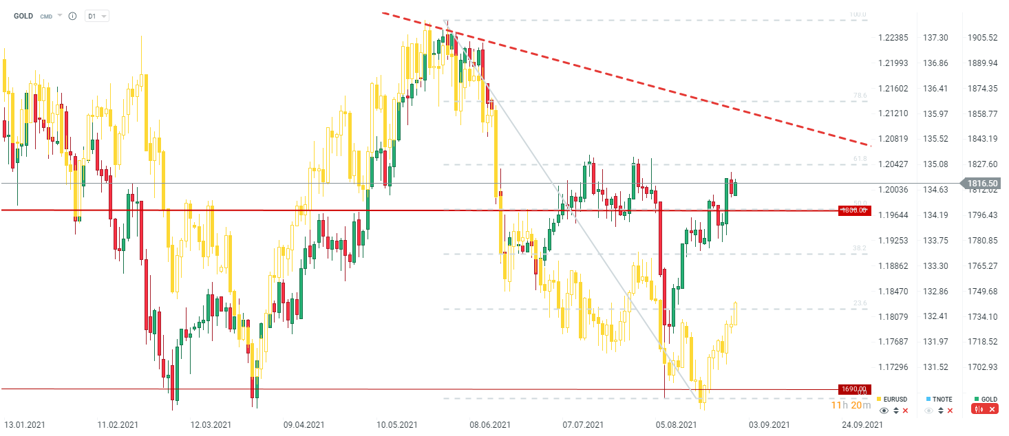O ouro tem vindo a ser negociado ligeiramente abaixo da primeira grande resistência junto dos $1,827-1,833 zona. A linha de tendência de baixa marca a próxima grande resistência. Fonte: xStation5