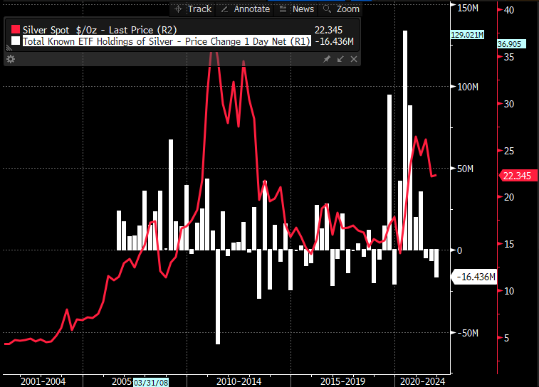 - A situação da procura não parece muito encorajadora. Os ETFs já estão a vender prata há 3 trimestres seguidos, o que é a pior sequência em anos