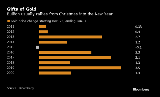 - Os padrões sazonais para o ouro apontam para um sólido período de fim de ano. O ouro tendeu a ganhar pelo menos 1% entre 23 de Dezembro e 3 de Janeiro