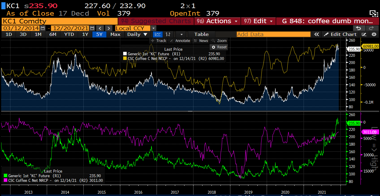 O posicionamento do chamado "dumb money" continua a apontar para uma forte tendência ascendente no mercado do café. Fonte: Bloomberg