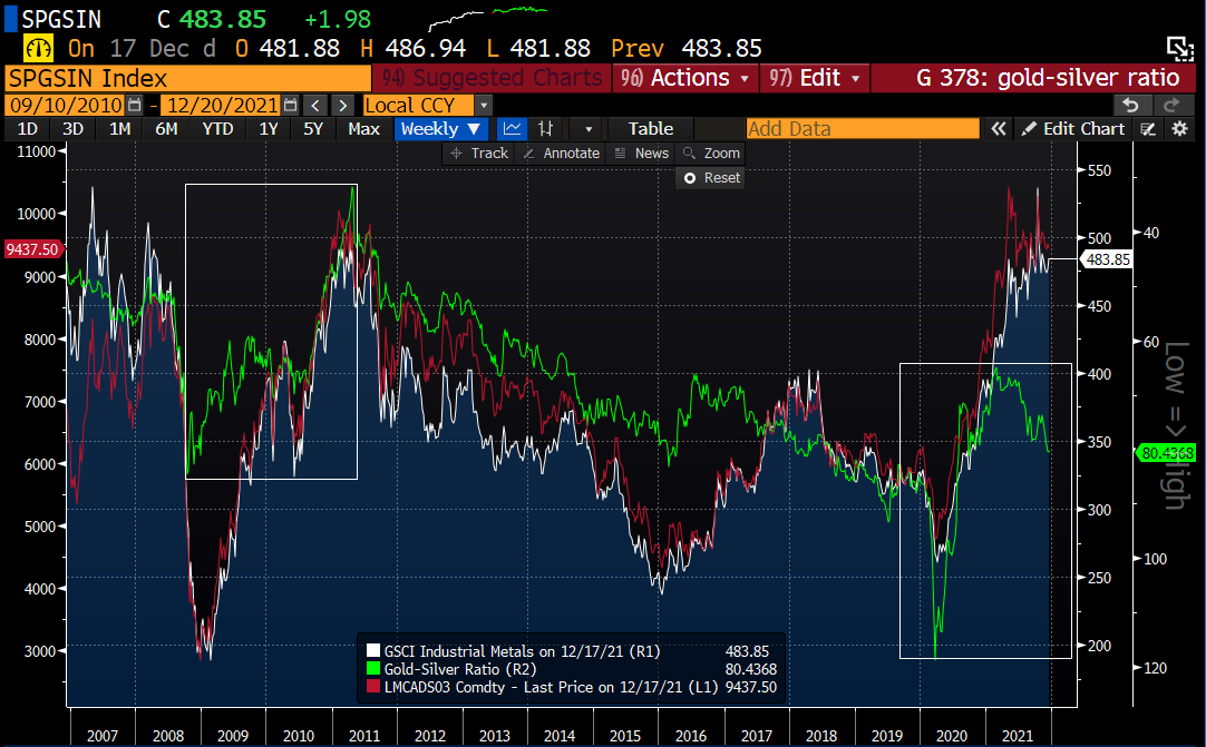 - A relação ouro-prata continua a aumentar, distanciando-se ainda mais de uma média a longo prazo (60-65). Além disso, o preço do cobre e o índice de metais de base sugerem que o rácio deveria ser muito mais baixo - como foi em 2011