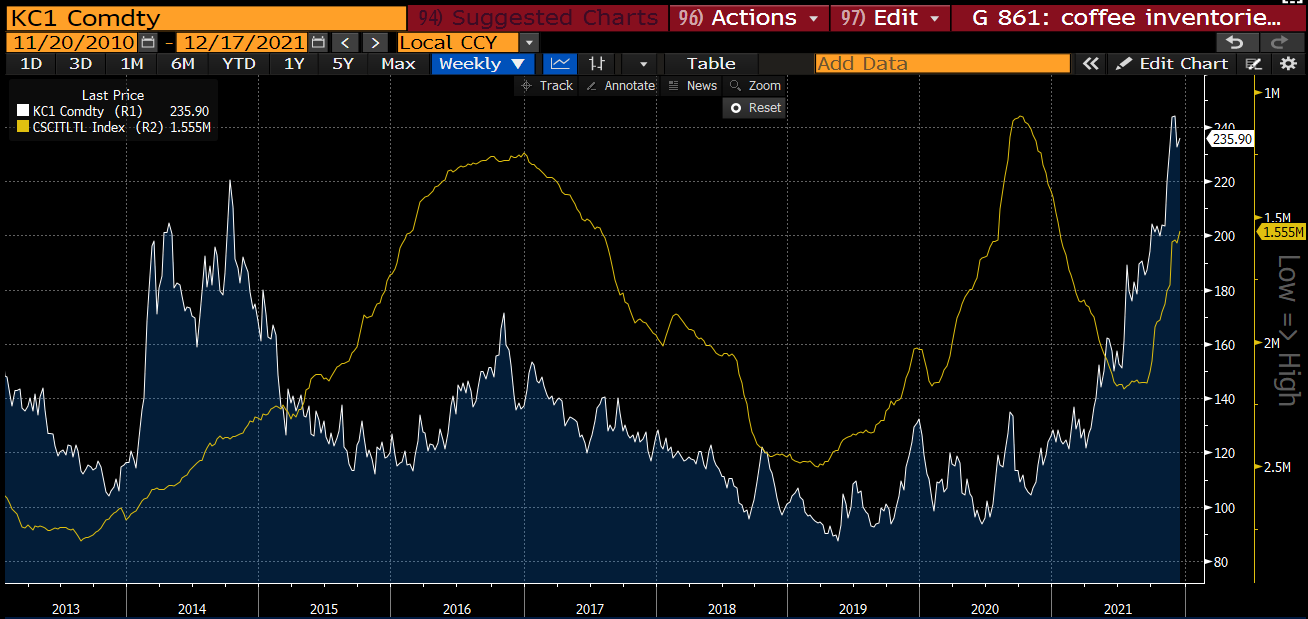 Os inventários do café voltaram a cair. Sugere que os preços do café devem permanecer em níveis elevados durante um período de tempo prolongado. Fonte: Bloomberg