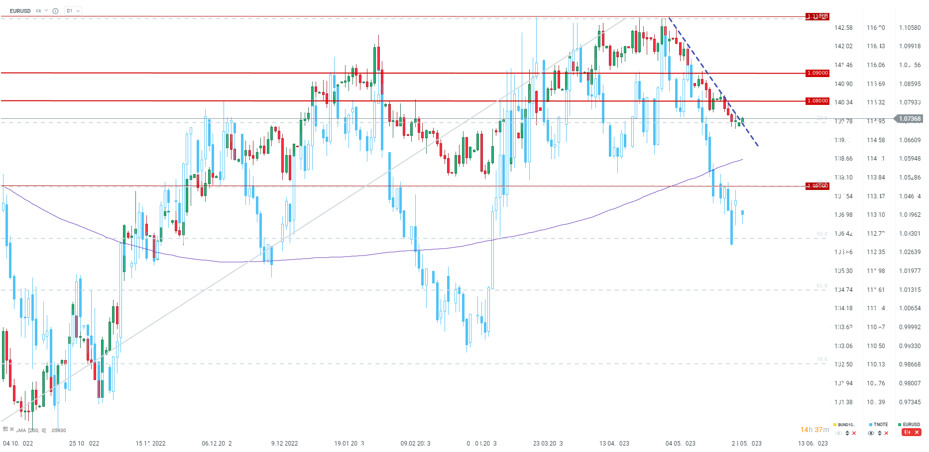 O EURUSD iniciou a nova semana de negociações pouco alterado, mas ganhou durante as horas de negociação asiáticas. No entanto, os ganhos foram apagados com o aumento das apostas hawkish da Reserva Federal e agora o par está a ser negociado perto dos mínimos da semana passada na área de 1,0710. O relatório do NFP para Maio, na sexta-feira, às 13:30 , será observado de perto, pois pode ser a dica final antes da reunião da Fed de Junho e pode cimentar as expectativas de aumento da taxa, caso mostre que o mercado de trabalho se mantém firme. Fonte: xStation5