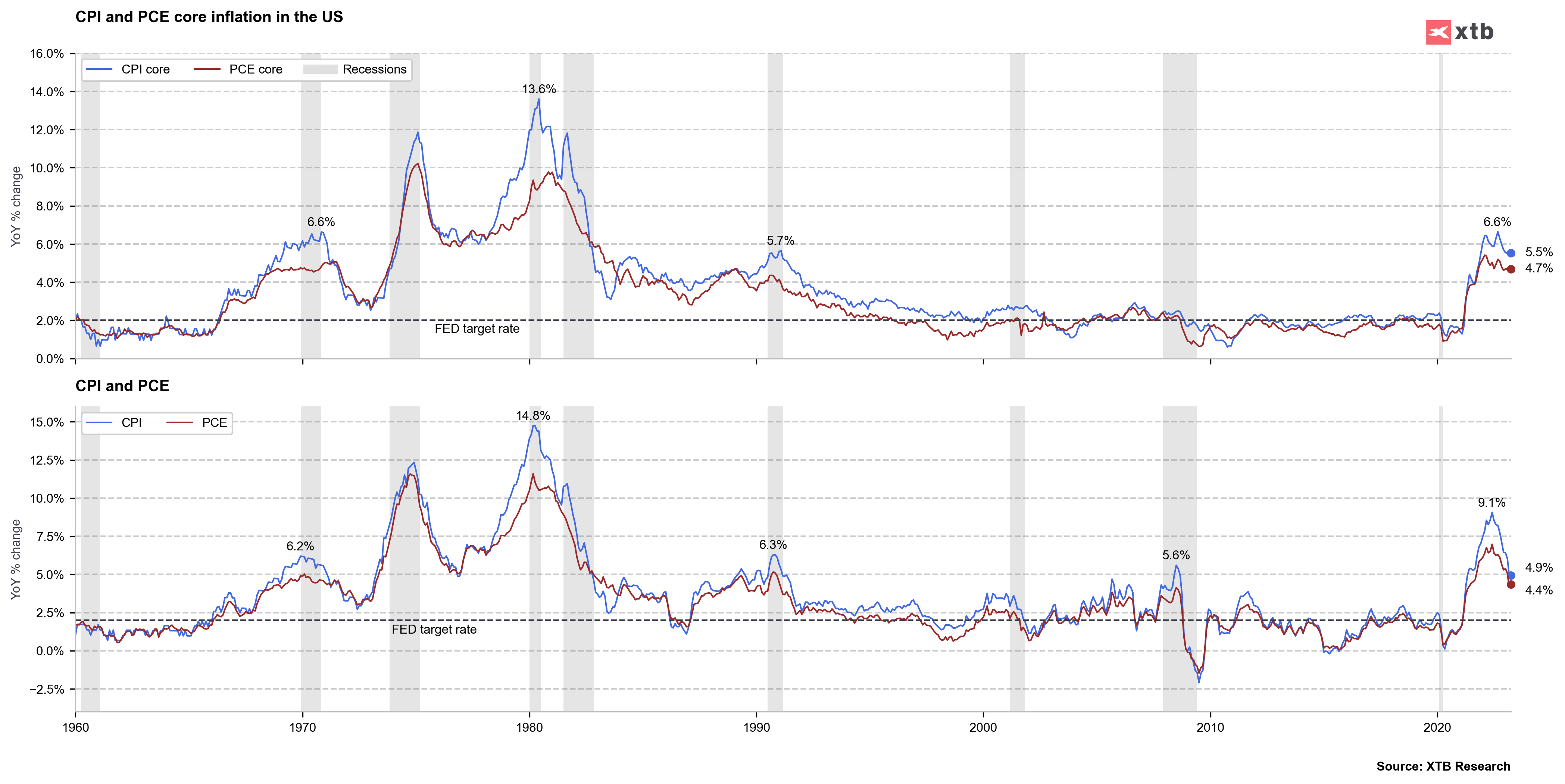 A inflação PCE subiu de 4,2% para 4,4% em Abril, enquanto o indicador principal acelerou de 4,6 para 4,7% em termos anuais. O aumento da medida de inflação preferida do Fed sugere que o banco central dos EUA pode permanecer hawkish por algum tempo. Fonte: Macrobond, XTB