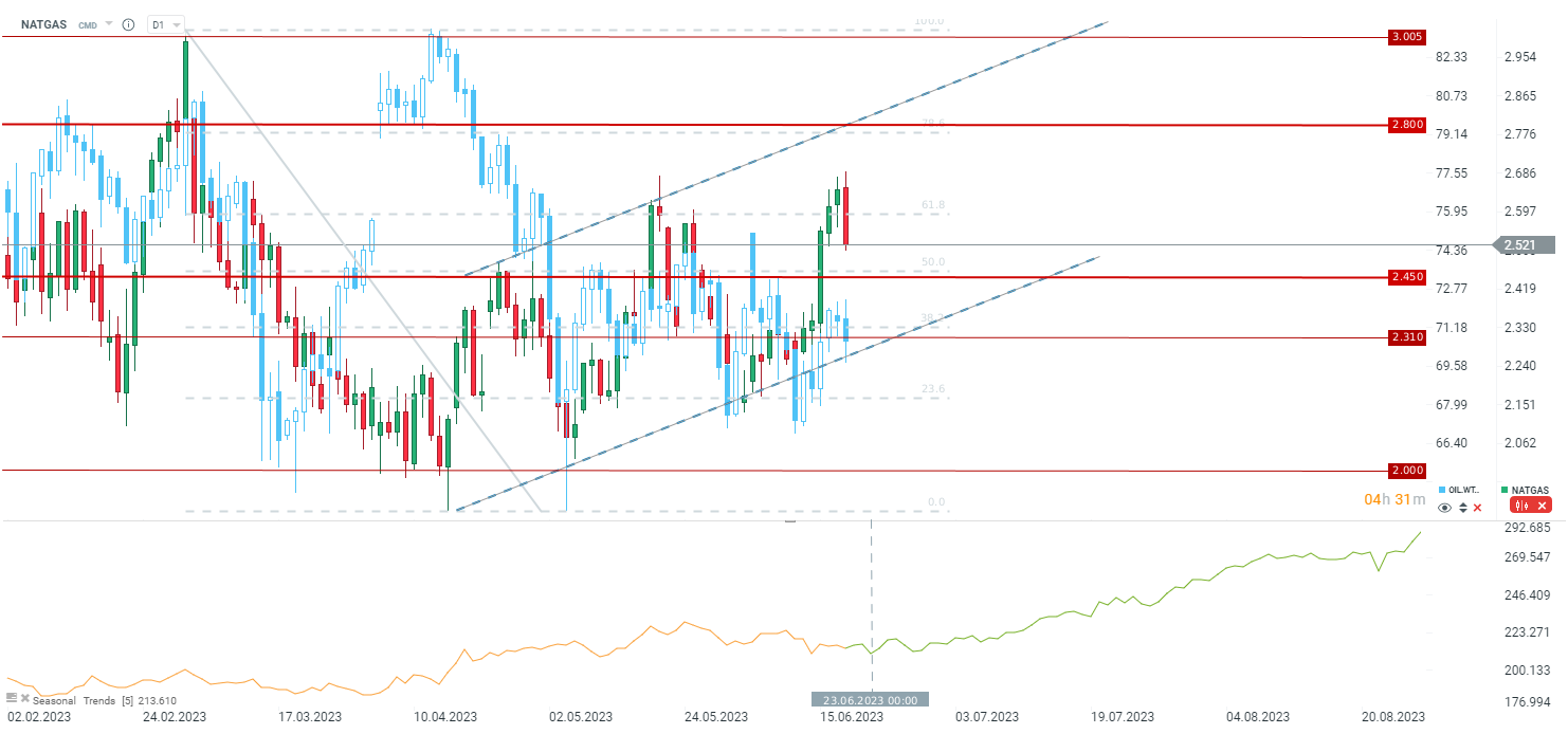 NATGAS está a negociar em queda de 5% . Um suporte fundamental pode ser encontrado na área de 2,45 com 2,30 sendo o próximo em linha. Os padrões sazonais sugerem que a baixa local pode ser alcançada até o final desta semana. Fonte: xStation5