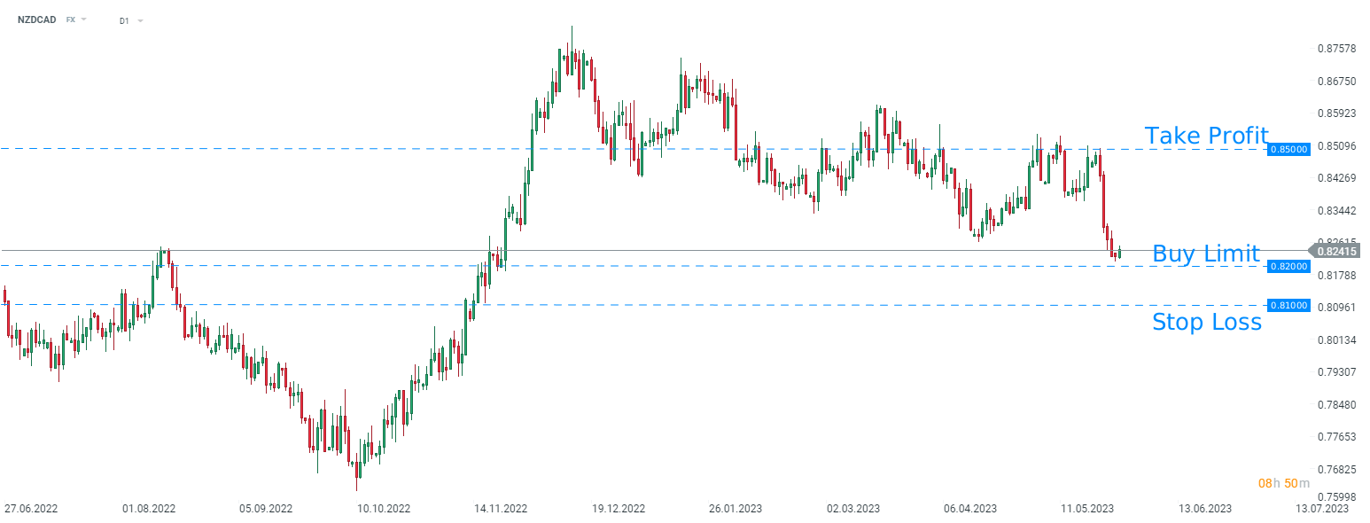 O ANZ recomenda colocar uma ordem pendente de compra no NZDCAD com buy limit nos 0,8200, um TP de 0,8500 e uma ordem de stop loss colocada em 0,8100. Fonte: xStation5