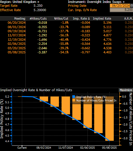 Os mercados monetários estão atualmente a prever uma probabilidade inferior a 2% de o Banco de Inglaterra reduzir a taxa hoje e uma probabilidade de cerca de 35% de o BoE reduzir as taxas na reunião de agosto. No entanto, os preços para setembro sugerem uma probabilidade superior a 70% de o Banco de Inglaterra proceder a um corte de 25 pontos base nas taxas nessa altura.