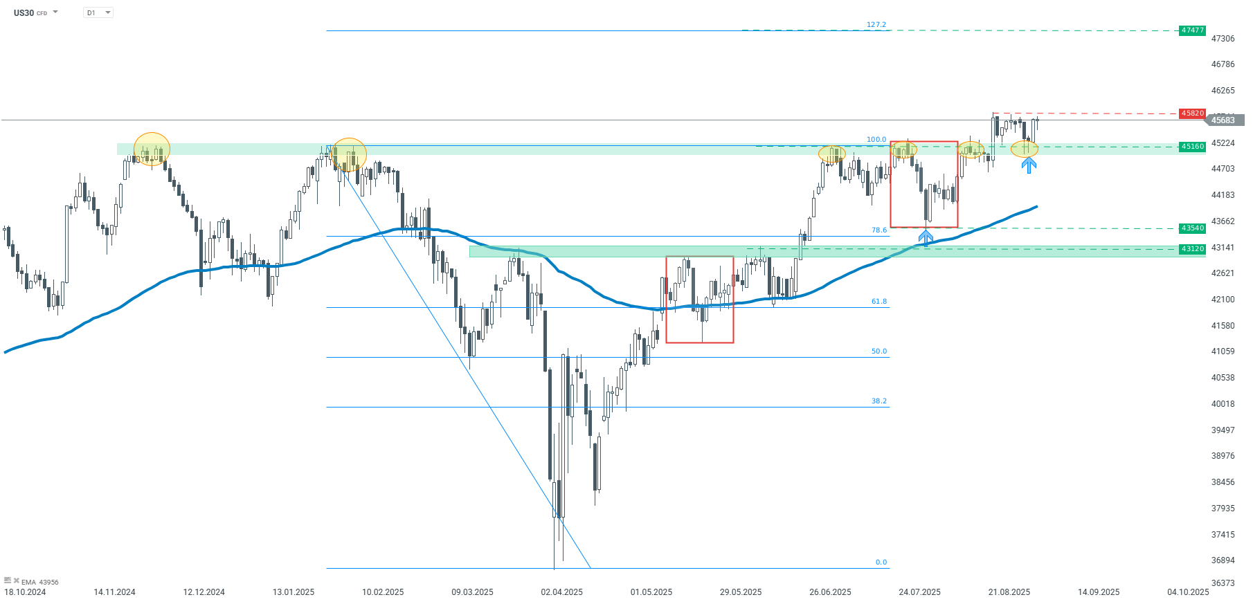 O índice US30 encerrou a sessão de ontem com um ganho sólido. Analisando o gráfico D1 de uma perspetiva técnica, o preço recuperou da zona de suporte horizontal em torno de 45.160 pontos, que mencionámos nas nossas análises recentes, e depois disparou. Atualmente, pouco antes do início da sessão à vista nos EUA, o preço está a aproximar-se da resistência em 45.820 pontos, que resulta de máximos anteriores e é também o nível mais alto da história. Uma quebra acima deste nível poderia abrir caminho para um movimento em direção aos 47.477 pontos, onde cai a medição externa de 127,2% da última grande correção descendente. Quanto ao cenário de correção, ele poderia se concretizar se o preço cair abaixo da zona acima mencionada, em 45.160 pontos.