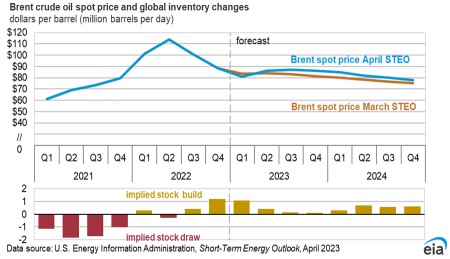 Apesar dos cortes de produção da OPEP+, a EIA ainda espera (embora mínima) um excesso de oferta no mercado petrolífero na segunda metade de 2023. Fonte: EIA