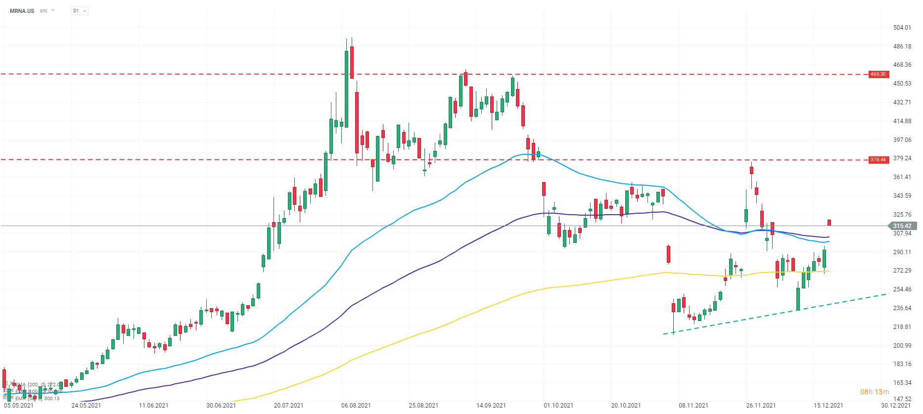 As ações da Moderna (MRNA.US) começaram a sessão de segunda-feira em Wall Street com um gap de alta, quebrando assim acima da resistência definida pela EMA 50 períodos (linha azul) e EMA 100 períodos (linha roxa). Fonte: xStation 5