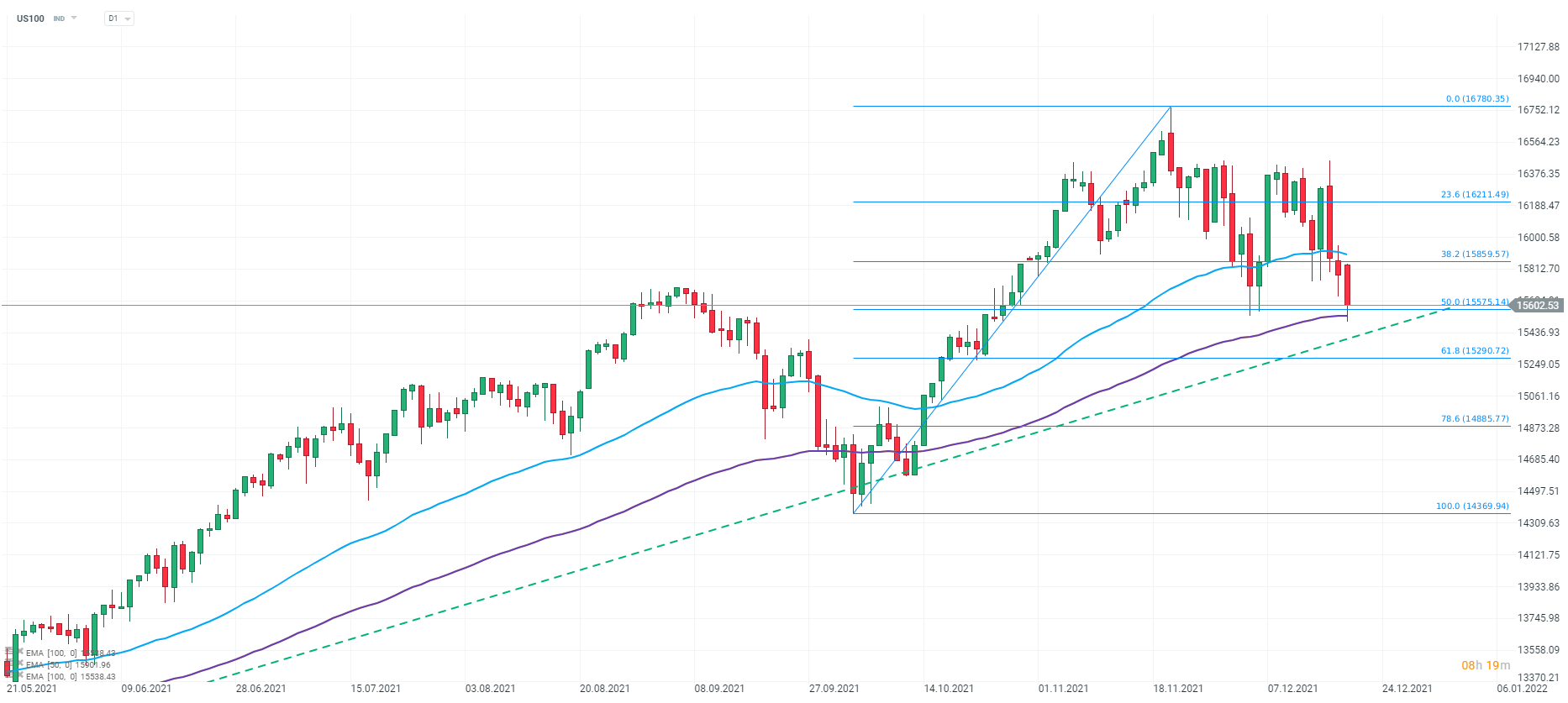 O US100 começou esta semana a ser negociado em baixa, e o índice está atualmente a testar a zona de suporte marcada pela EMA 100 períodos (linha roxa) e da retração de Fibonacci nos 50%. Perto deste nível existe também há nível de suporte importante determinado pela linha de tendência ascendente a longo prazo. Fonte: xStation 5