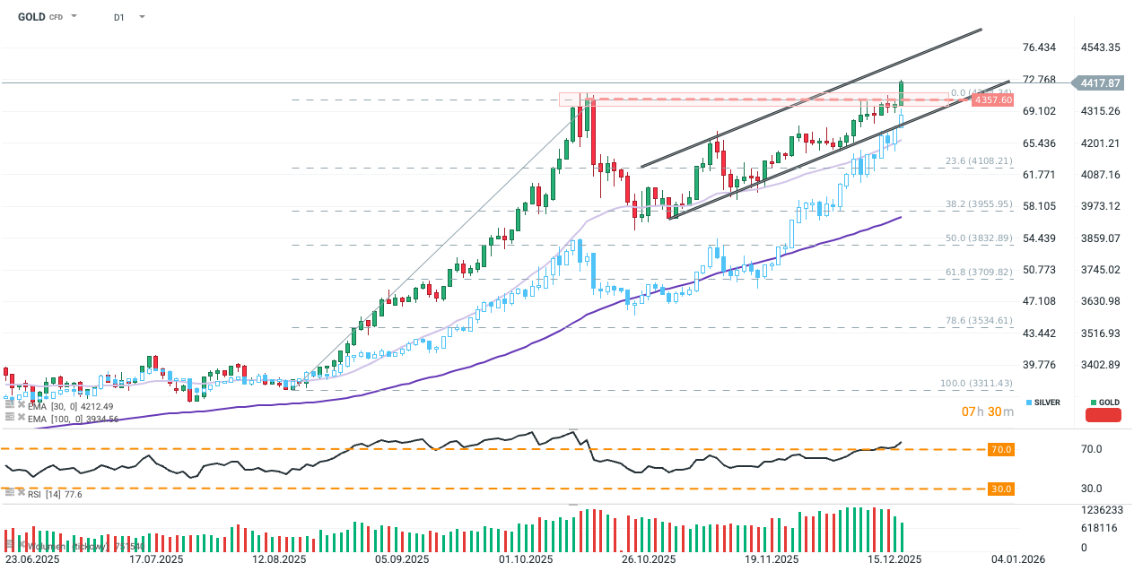 O ouro e a prata estão a iniciar a semana, encurtada devido ao feriado, com fortes ganhos de alta (Ouro: +1,8% para cerca de $4.420, Prata: +2,5% para cerca de $68,20), levando os principais metais preciosos a novos máximos históricos. A procura por refúgios seguros está a ser impulsionada principalmente pelo posicionamento do mercado em relação à política monetária dos EUA em 2026, bem como pelas crescentes tensões entre a Venezuela e os Estados Unidos.