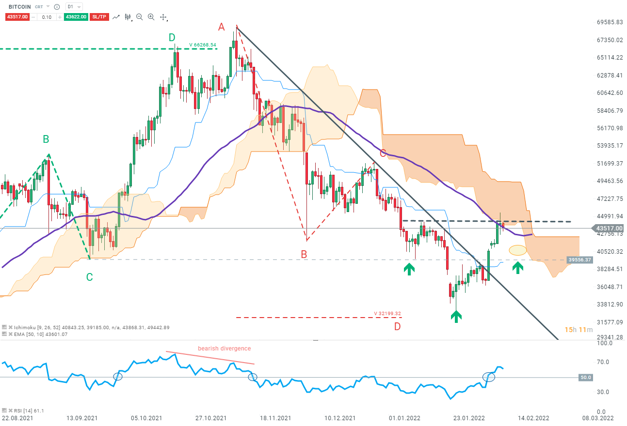 Além disso, com base no Ichimoku, podemos ver que a nuvem diária actuou como uma resistência e abrandou o aumento dos preços. Apenas uma quebra desta nuvem daria um sinal de alta. Contudo, é possível um declínio a curto prazo e, neste caso, veremos a formação do ombro direito (terceira seta verde) de um padrão OCO invertido com uma neckline nos 44.500 dólares. Se este cenário ocorrer, a quebra da neckline será acompanhada por um cruzamento da nuvem, e a próxima resistência poderá ser encontrada nos $55.400 dólares.