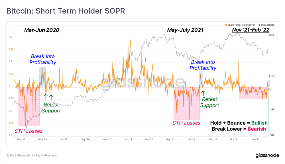 Um padrão semelhante pode ser visto em dois casos desde Março de 2020. Após um longo período de perdas, o mercado conseguiu entrar numa tendência ascendente, com um reteste STH-SOPR de 1,0 para confirmar. Se observarmos uma quebra STH-SOPR mais elevada como antes, indica uma rentabilidade renovada e a entrada da procura está a absorver moedas. Por outro lado, uma quebra abaixo de 1,0 seria um indicador de baixa, e sugere que há uma procura insuficiente para suportar a pressão de venda dos detentores a curto prazo.