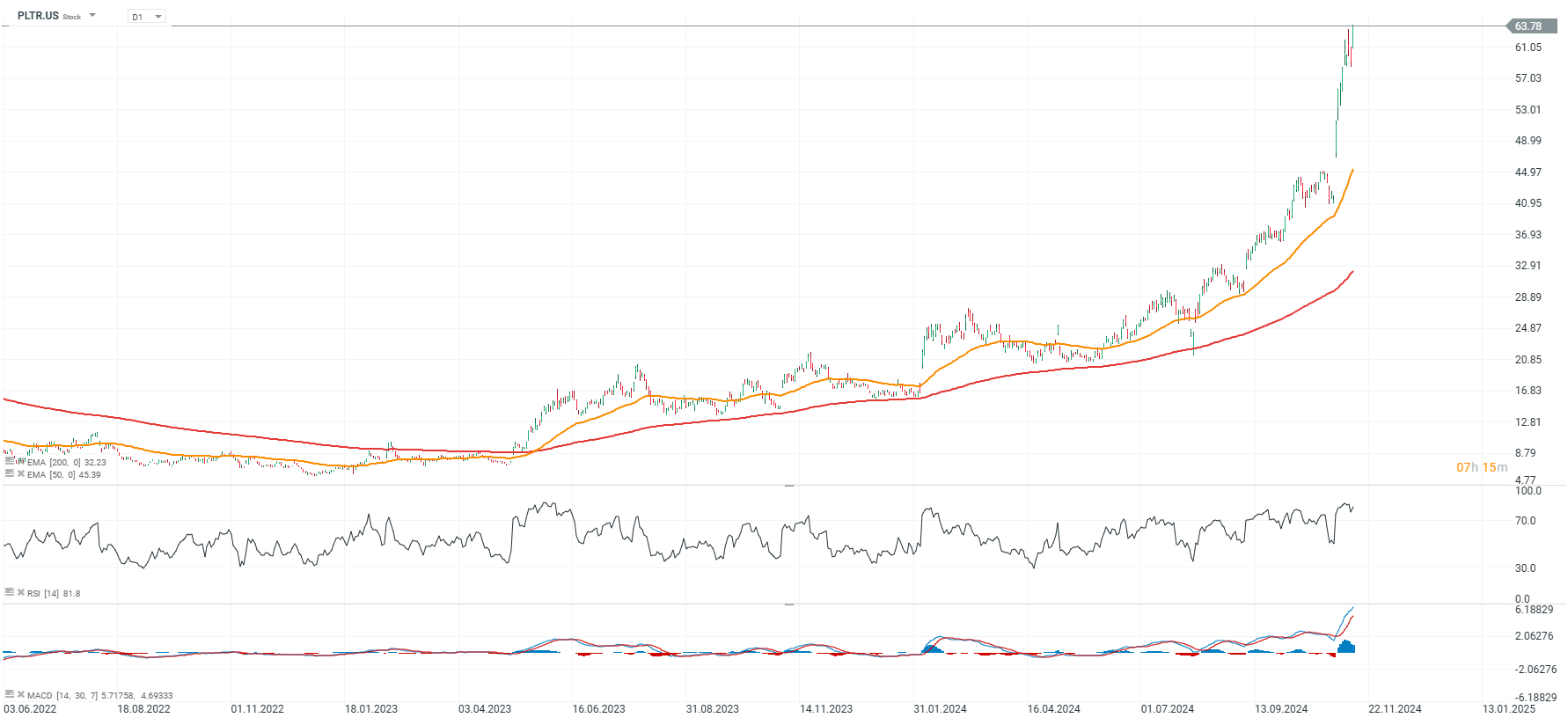 As ações da Palantir estão a ser negociadas com o dobro do prémio da EMA200 (linha vermelha); os investidores esperam que as novas plataformas da empresa melhorem significativamente as suas receitas e lucros nos próximos anos, e estão a pagar um enorme prémio por isso, com o rácio preço-lucro a 300.