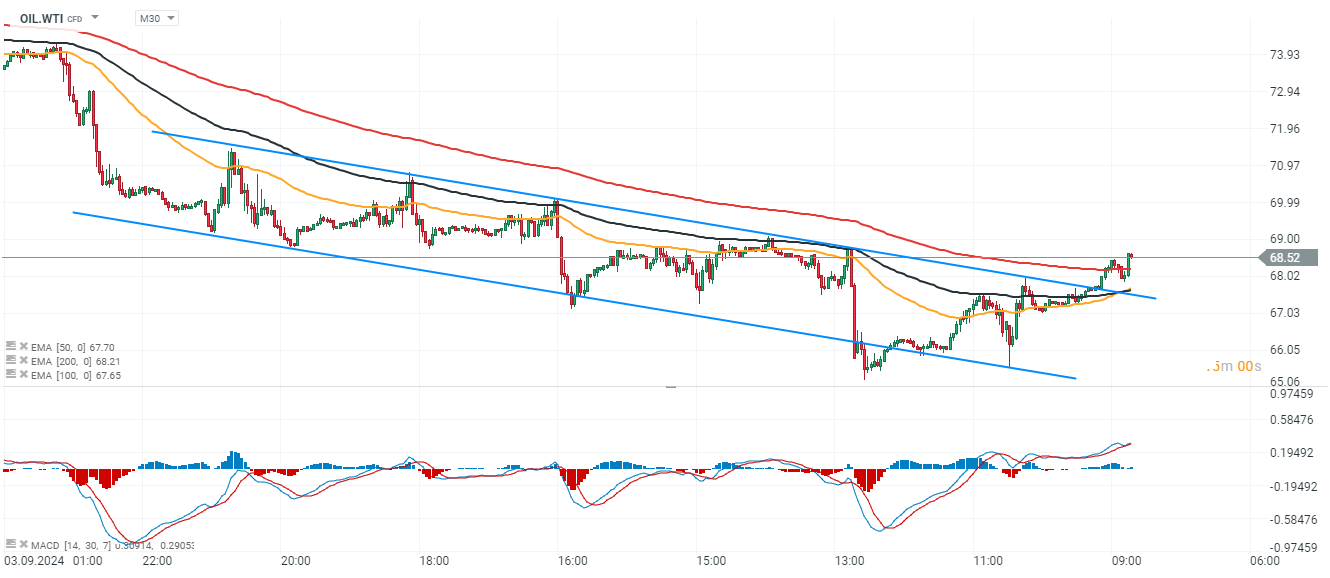 Os preços do petróleo continuam a subir hoje, com o dólar americano a ser apoiado pelos dados do IPC de ontem, e pela suspensão de uma parte significativa da capacidade de produção no Golfo do México, após o furacão Francine ter atingido a costa do Louisiana esta noite. Cerca de 39% da capacidade de produção dos EUA no Golfo do México foi interrompida por causa disso. Receios sobre a produção de petróleo dos EUA podem apoiar os aumentos de preços WTI para a zona de US $ 70, onde podemos ver a primeira zona de forte resistência. Por outro lado, para indicar uma recuperação, o petróleo precisaria de dados económicos muito sólidos, especialmente da China e dos EUA. Por enquanto, a principal tendência ainda é de baixa.