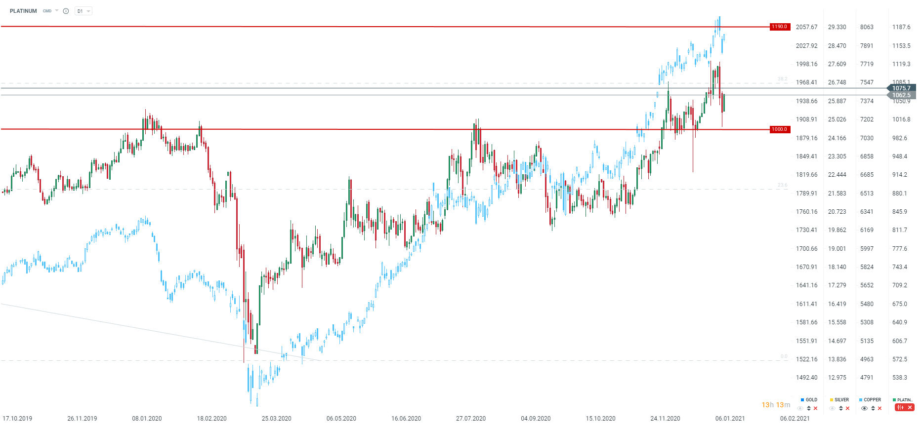 Platina é uma das matérias-primas com o melhor desempenho hoje. O metal precioso continua a recuperar das quedas de curto prazo após um teste de suporte em $ 1.000. Os máximos locais de 2015 perto da marca de US $ 1.200 podem ser uma meta de curto prazo para a platina. Os metais industriais também estão continuam a recuperar. Fonte: xStation5