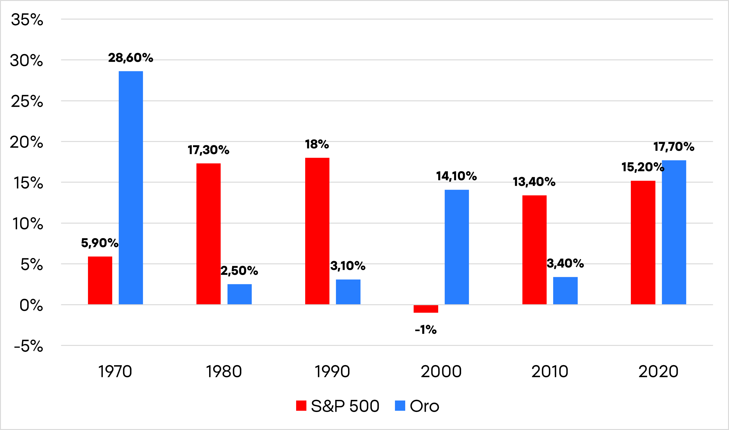 Desempenho anualizado do ouro e do S&P 500 por década. Fonte: XTB.