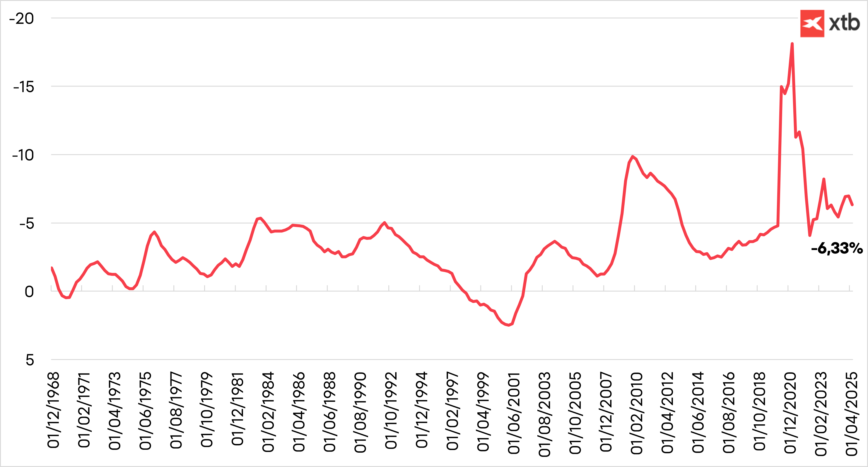 Défice orçamental dos EUA em percentagem do PIB. Fonte: XTB