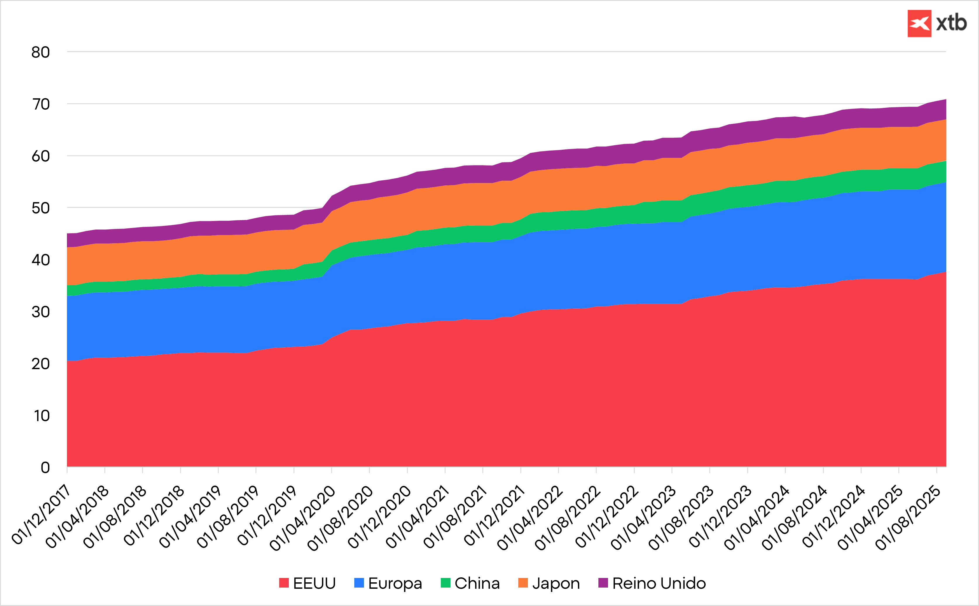 Crescimento da dívida em triliões de dólares nas principais economias. Fonte: XTB