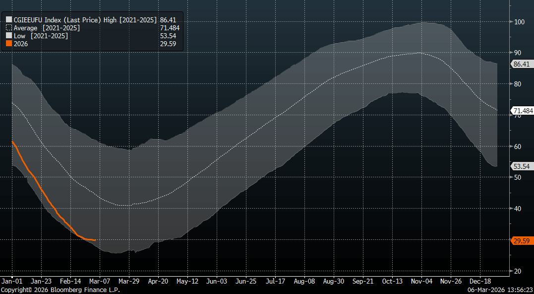 Em paralelo, Bruxelas mantém a pressão sobre a energia russa, incluindo o novo price cap do crude russo em USD 47,6/bbl, o que reduz ainda mais a margem para absorver choques sem impacto em preços e inflação.