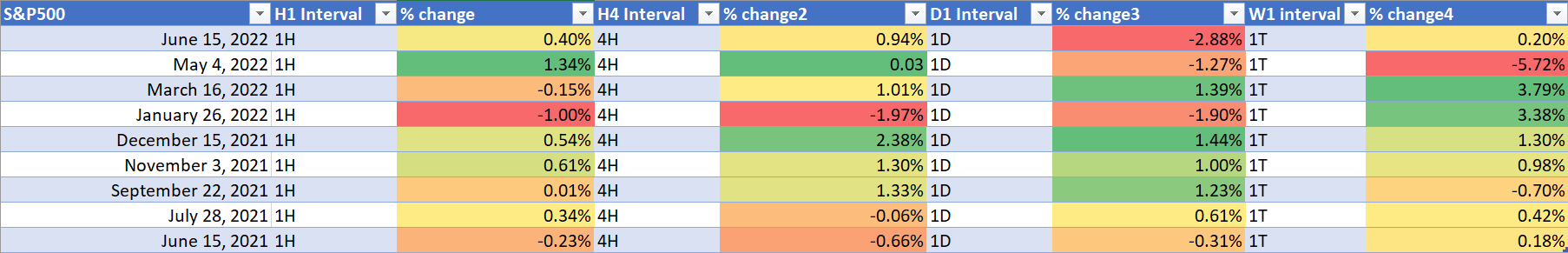 Analisando a reacção do mercado às recentes decisões do FOMC, podemos ver que o S&P 500 caiu normalmente nos primeiros minutos após o anúncio (as surpresas recentes foram hawkish). Por outro lado, olhando para o desempenho do S&P 500 durante 1 a 4 horas após o anúncio, podemos ver que o índice normalmente recuperou as perdas anteriores. No entanto, o S&P 500 recuou durante um período de 1 dia ou 1 semana após os dois últimos anúncios de decisão. Um ponto a salientar é que a recente decisão do FOMC tende a provocar picos de volatilidade maiores do que os anúncios do ano anterior.