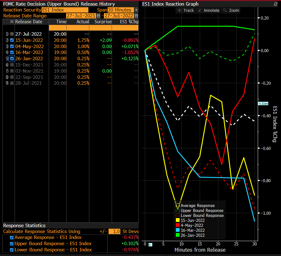O S&P 500 tende a cair nos primeiros 30 minutos após a decisão do FOMC. Apenas a decisão de Janeiro teve uma reacção positiva este ano, durante um período de 30 minutos após o anúncio. Fonte: FOMC: Bloomberg