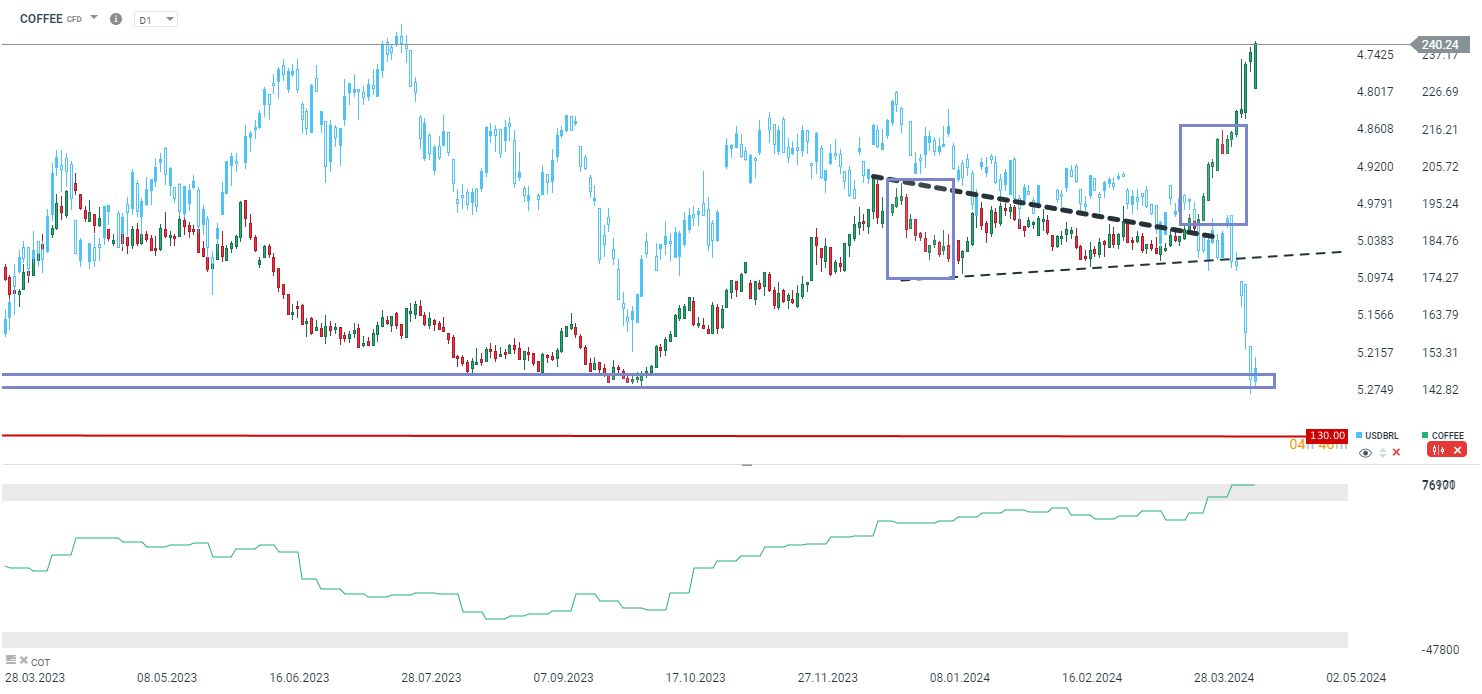Neste momento, estamos a assistir a uma total anomalia no mercado do café (embora funcione de forma diferente nos mercados do açúcar e da soja). O real brasileiro muito fraco (dólar forte e cortes recentes do banco central brasileiro) não enfraquece o mercado do café. Além disso, a procura de café brasileiro está a aumentar devido a restrições de produção noutras regiões do mundo, principalmente devido à limitação da produção de Robusta. Curiosamente, espera-se que a atual época de café Arábica seja forte, mas os preços continuam a subir acentuadamente e as posições dos especuladores estão num máximo histórico de alta.