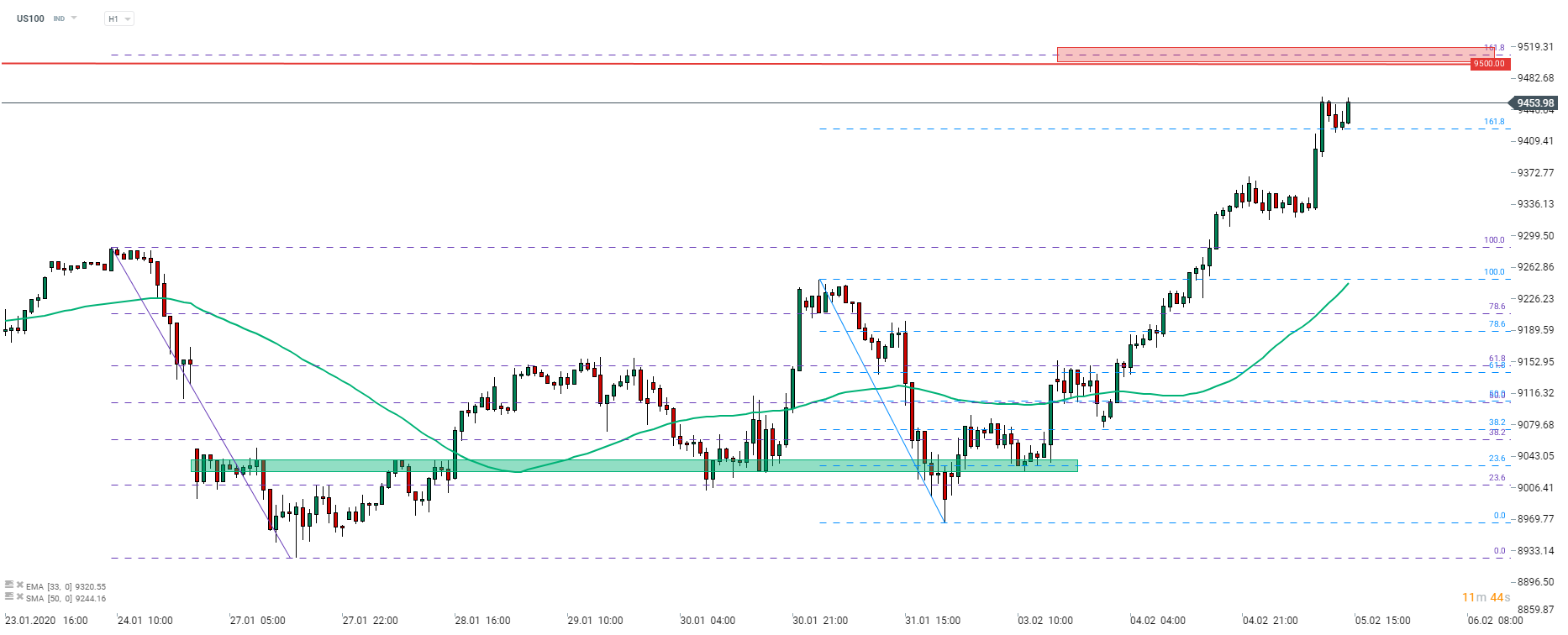 O US100 recupera totalmente da queda da semana passada e sobiu para novos recordes ontem. O índice encontrou suporte nos 161,8% de retração externa da correção da semana passada e subiu rapidamente. O nível potencial a ser observado no curto prazo pode ser encontrado na retração externa de 161,8% da correção descendente iniciada a 24 de janeiro - 9510 pts. Fonte: xStation5