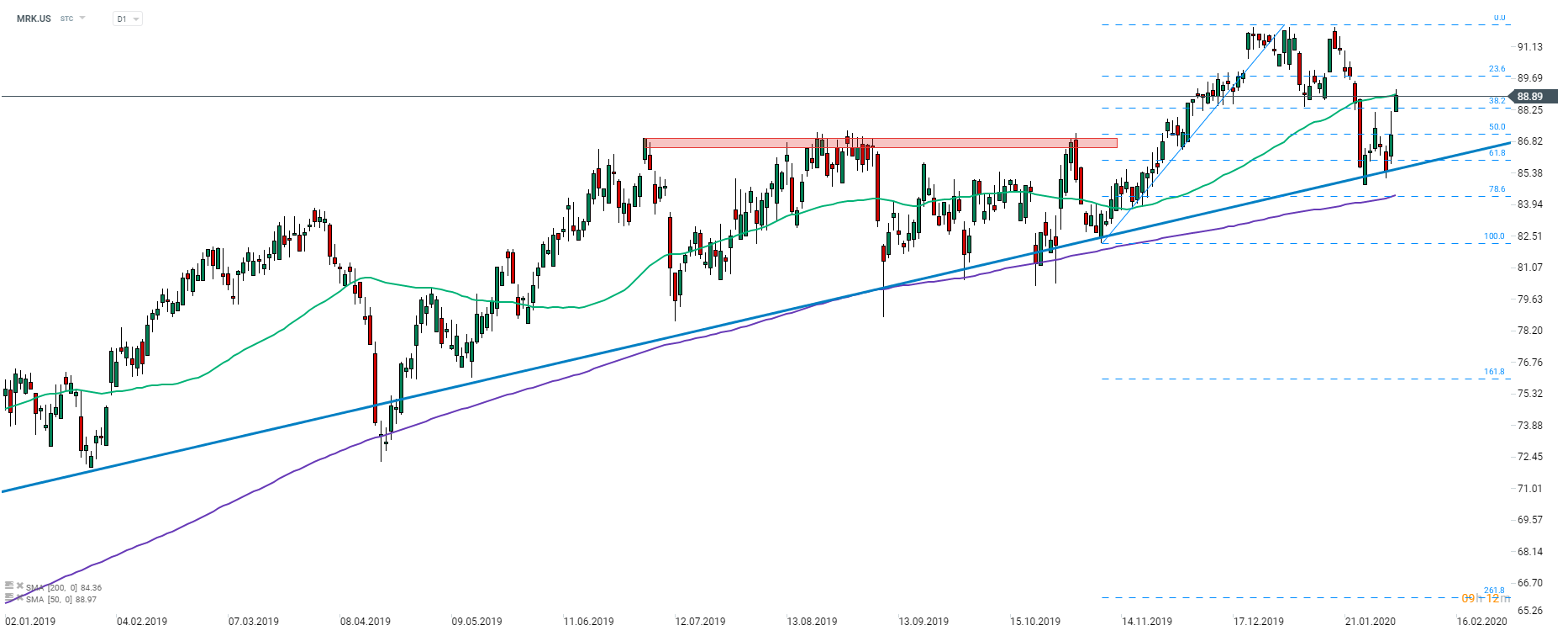 A Merck (MRK.US) iniciou uma recuperação no início desta semana. As ações atingiram a média móvel de 50 sessões (linha verde) ontem e devem abrir hoje em alta, já que os investidores estão a avaliar o impacto de uma cisão. Se a queda continuar durante o horário de negociação, os mínimos recentes acima de US $ 85 podem ser um suporte. Fonte: xStation5