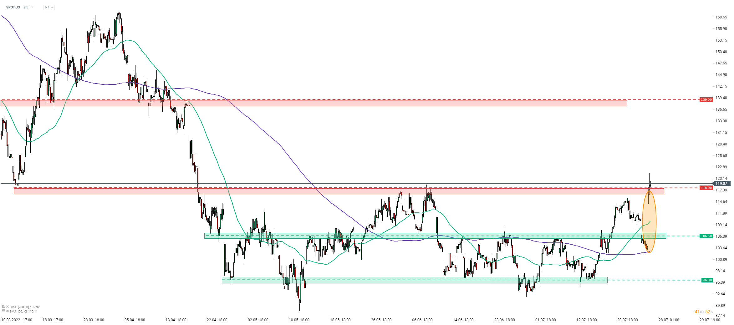 Spotify (SPOT.US) subiu após o lançamento do relatório de ganhos do segundo trimestre de 2022 (círculo laranja). A ação conseguiu quebrar acima da zona de resistência de 118,00 dólares e está a negociar ao mais alto nível desde 21 de Abril de 2022. O forte crescimento no MAU está a alimentar os ganhos do preço das acções hoje em dia. A próxima zona de resistência a observar pode ser encontrada abaixo dos $139,00. Fonte: xStation5