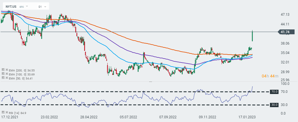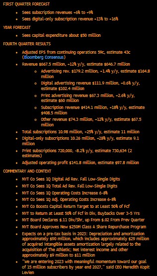 As acções do New York Times (NYT.US) estão a ganhar quase 14% na sequência da publicação de resultados melhores do que o esperado no quarto trimestre. A empresa relatou vendas e lucros melhores do que o esperado, como resultado de um aumento nas subscrições digitais.