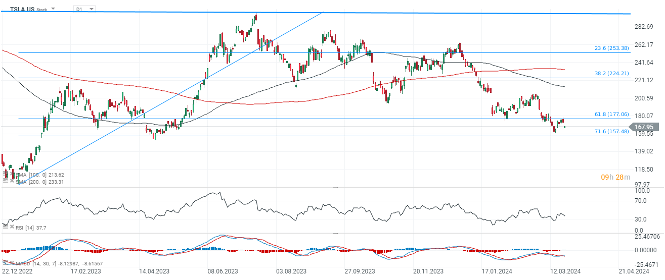 As ações estão a ser negociadas abaixo do SMA200, e a capitalização da empresa já caiu quase 250 mil milhões de dólares este ano. O preço saltou da resistência na retração de Fibonacci de 61,8, a $177 por ação, e poderia teoricamente testar a área em torno da retração de 61,8, a $157. Estes são também os níveis do mínimo local de abril de 2023.