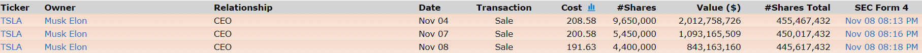 Num processo junto da SEC na terça-feira, Musk informou ter vendido 19.500.000 acções em três dias, em Novembro. Fonte; Finviz, SEC