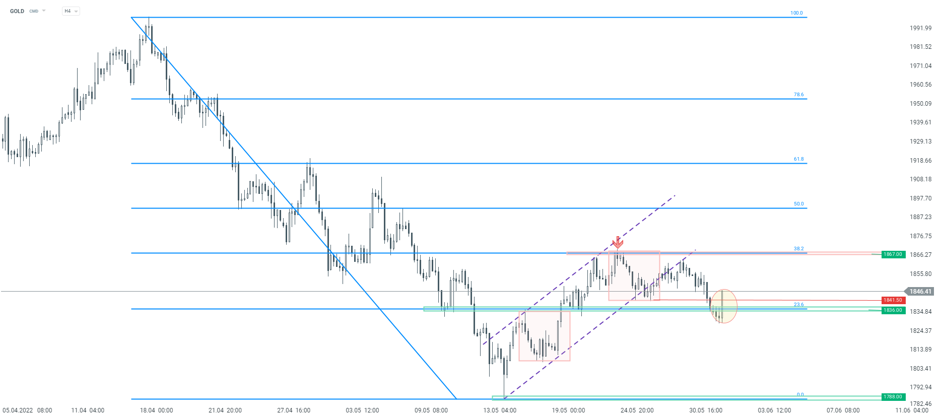 Quando se trata do mercado do ouro, a última correcção parou na medida de 38,2% da onda de baixa, que começou em meados de Abril. A análise técnica pode apoiar a continuação da tendência para a baixa. Importante para a continuação da direcção do preço será se o preço permanecerá abaixo da zona $1841,50 - $1836,00. Se assim for, outro impulso para a baixa recente de $1788,00 deverá estar nos cartões. Por outro lado, se os compradores recuperarem o controlo, poderá levar a um reteste da resistência a $1867.