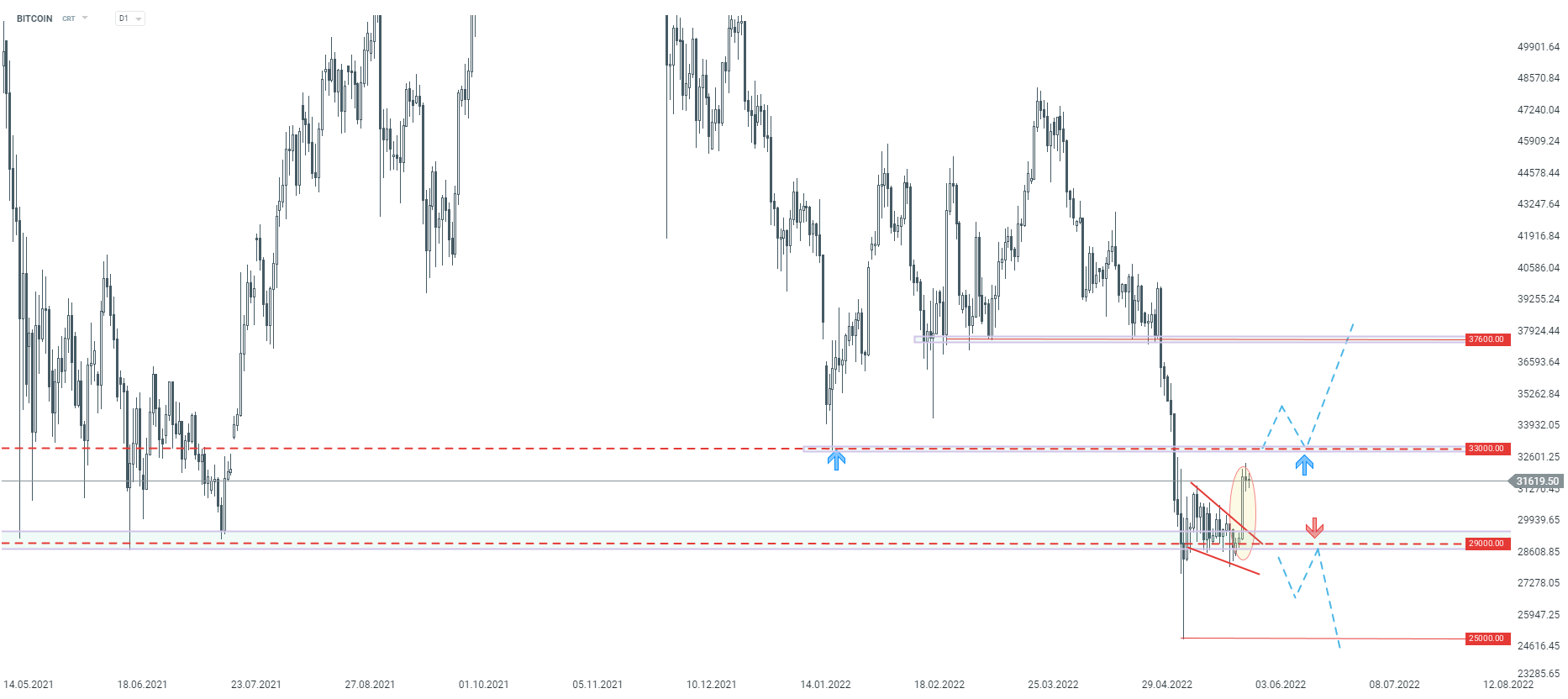A sessão de segunda-feira trouxe rally dinâmico sobre o mercado de criptomoedas. O preço da bitcoin conseguiu deixar a consolidação local, mas o entusiasmo dos touros do mercado arrefeceu rapidamente. Olhando para o intervalo D1, a situação técnica permaneceu basicamente inalterada. Apesar de um grande vela bullish em D1, o preço mantém-se abaixo da resistência chave em 33.000 dólares. Apenas o intervalo acima poderia provocar um maior ressalto para $37.600. Por outro lado, se os vendedores assumirem a liderança e o apoio a $29.000 for quebrado, a Bitcoin poderia voltar à tendência de baixa e atingir os recentes mínimos a $25.000.