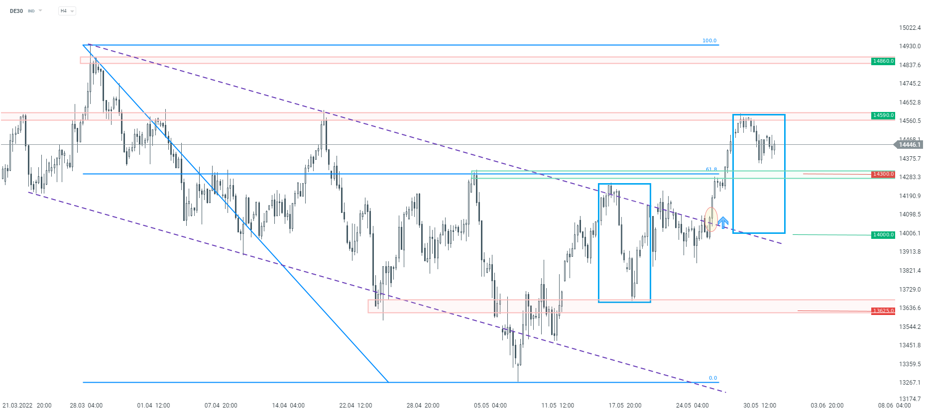 Olhando para o gráfico H4 do índice alemão DAX (DE30) de um ponto de vista técnico, o preço deixou recentemente o canal de tendência descendente e conseguiu quebrar acima da resistência em 14.300 pontos. Contudo, o movimento ascendente parou em torno da zona de resistência em 14.590 pontos, o que funcionou como um grande obstáculo para os compradores. Caso ocorra uma quebra mais alta, os máximos a partir do final de Março - cerca de 14.860 pontos - tornar-se-ão o próximo alvo para os touros do mercado. Por outro lado, caso ocorra um movimento de correcção, a zona de cerca de 14.300 pontos continua a ser o principal apoio. A sua negação poderia empurrar o índice para 14.000 pontos, onde se encontra o limite inferior da estrutura 1:1.