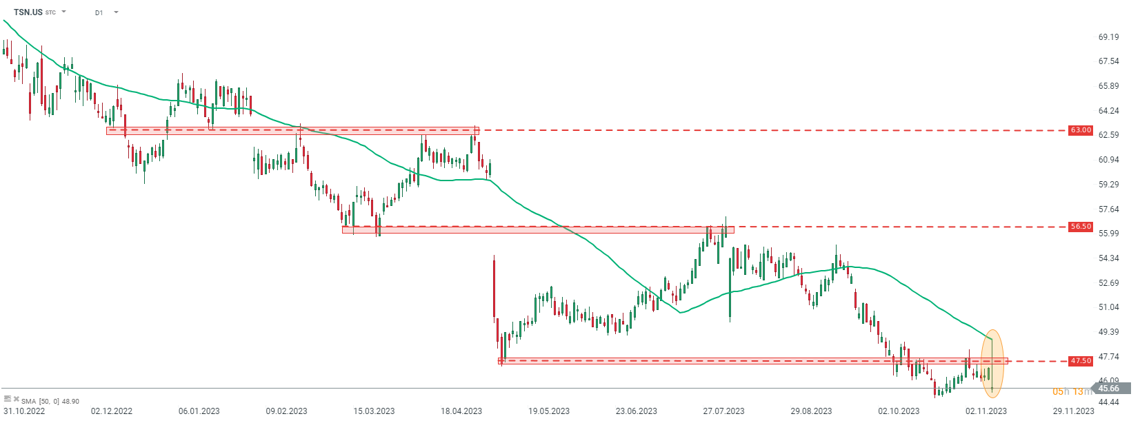A Tyson Foods (TSN.US) está a negociar em baixa após a divulgação dos resultados do quarto trimestre fiscal de 2023, hoje, antes da abertura da sessão a dinheiro de Wall Street. As empresas alimentares dos EUA apresentaram resultados mistos, com as vendas a ficarem abaixo das expectativas e os lucros a superarem as expectativas. No entanto, as previsões para o exercício fiscal de 2024 ficaram aquém das expectativas dos analistas.