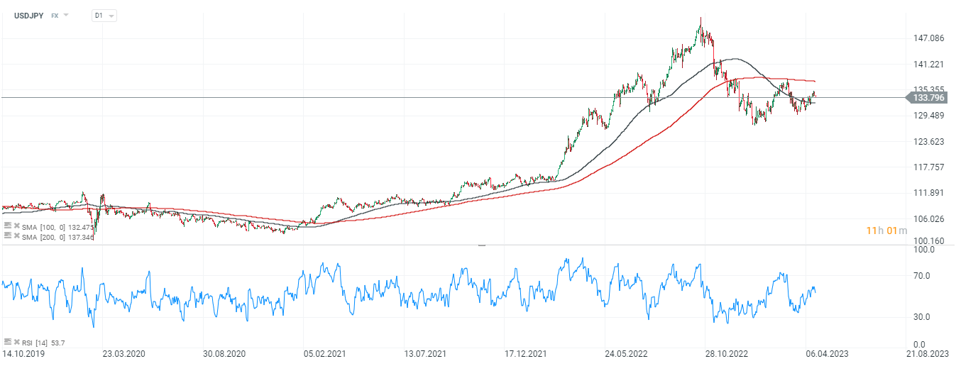 USDJPY, intervalo D1. As médias SMA100 e SMA200 formaram uma formação de "cruz de morte", o que pode sugerir movimentos descendentes. Fonte: xStation5